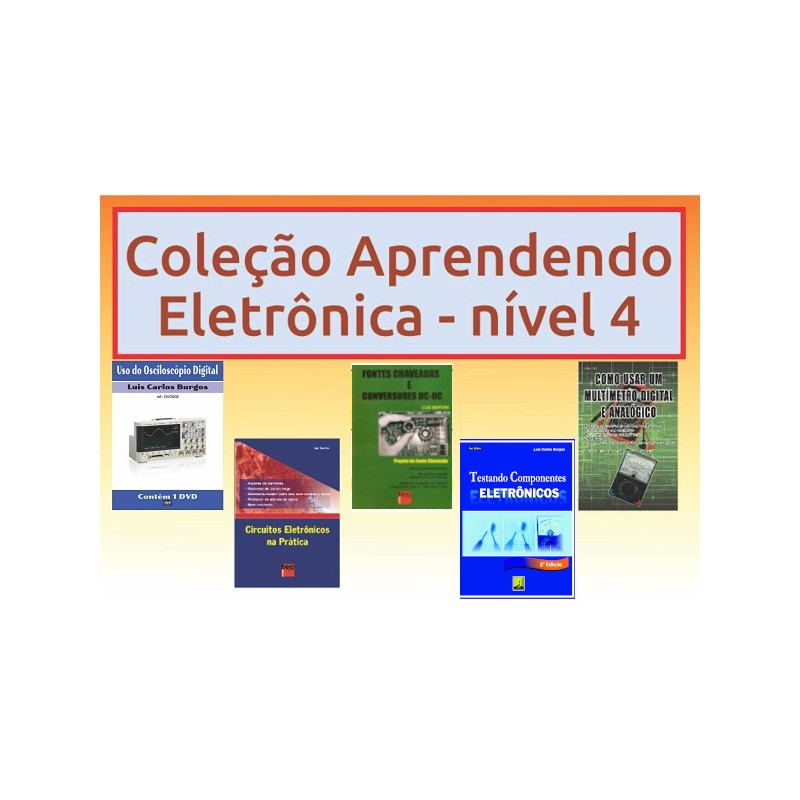 Coleção Completa Aprendendo Eletrônica composta de 5 níveis com módulos(livro+DVD aula) visando facilitar o leitor na aquisição gradativa dos respectivos que estão disponíveis para venda de forma avulsa.